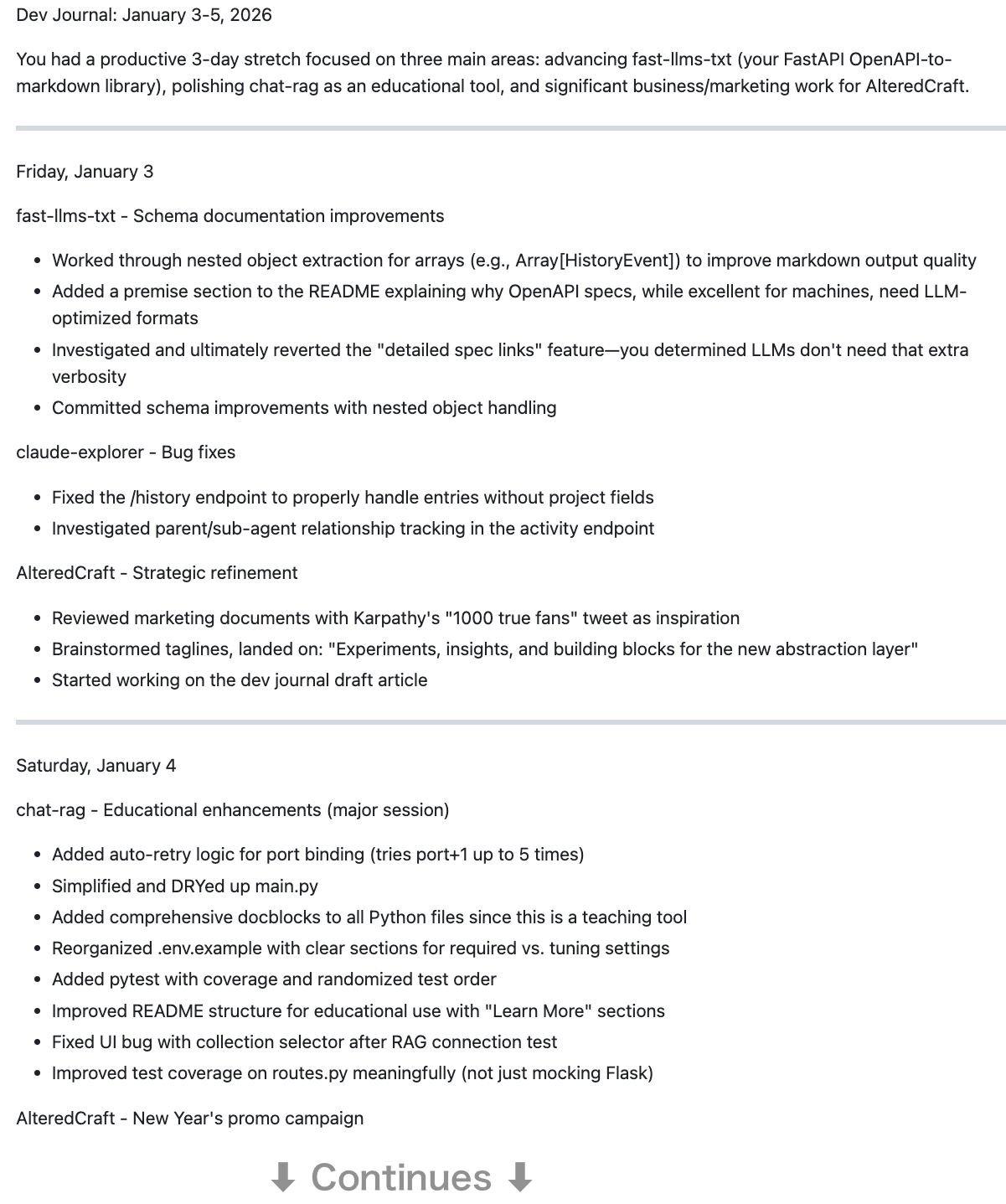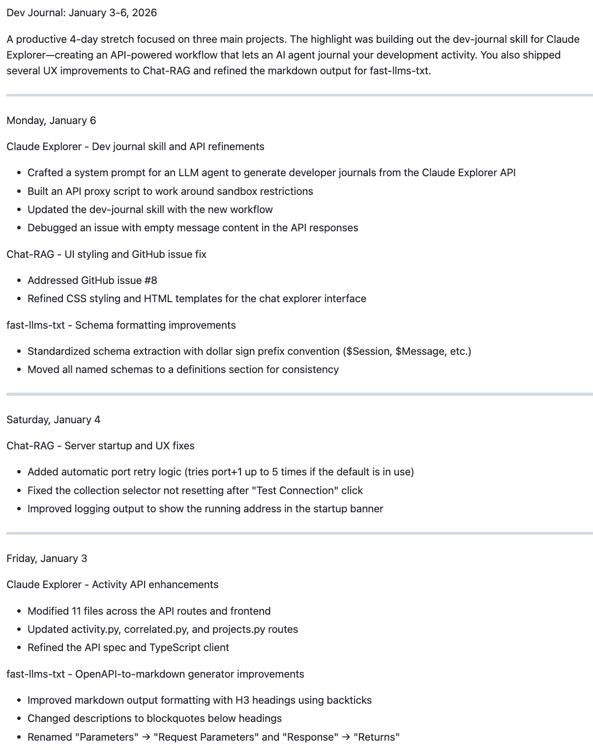 With the Skill installed I asked Claude Code for a dev journal of the last three days. Here’s what I got: